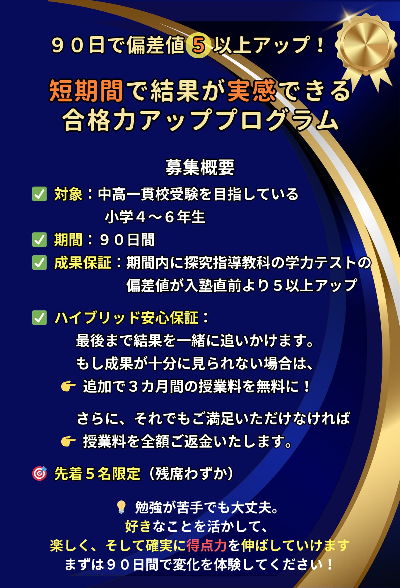 受験勉強が「つらい時間」ではなく、「自分の成長と成功へのステップ」へと変わります。受験後の学校生活やその先の人生でも必要な「考える力」。未来につながる学びを、ぜひお任せください!