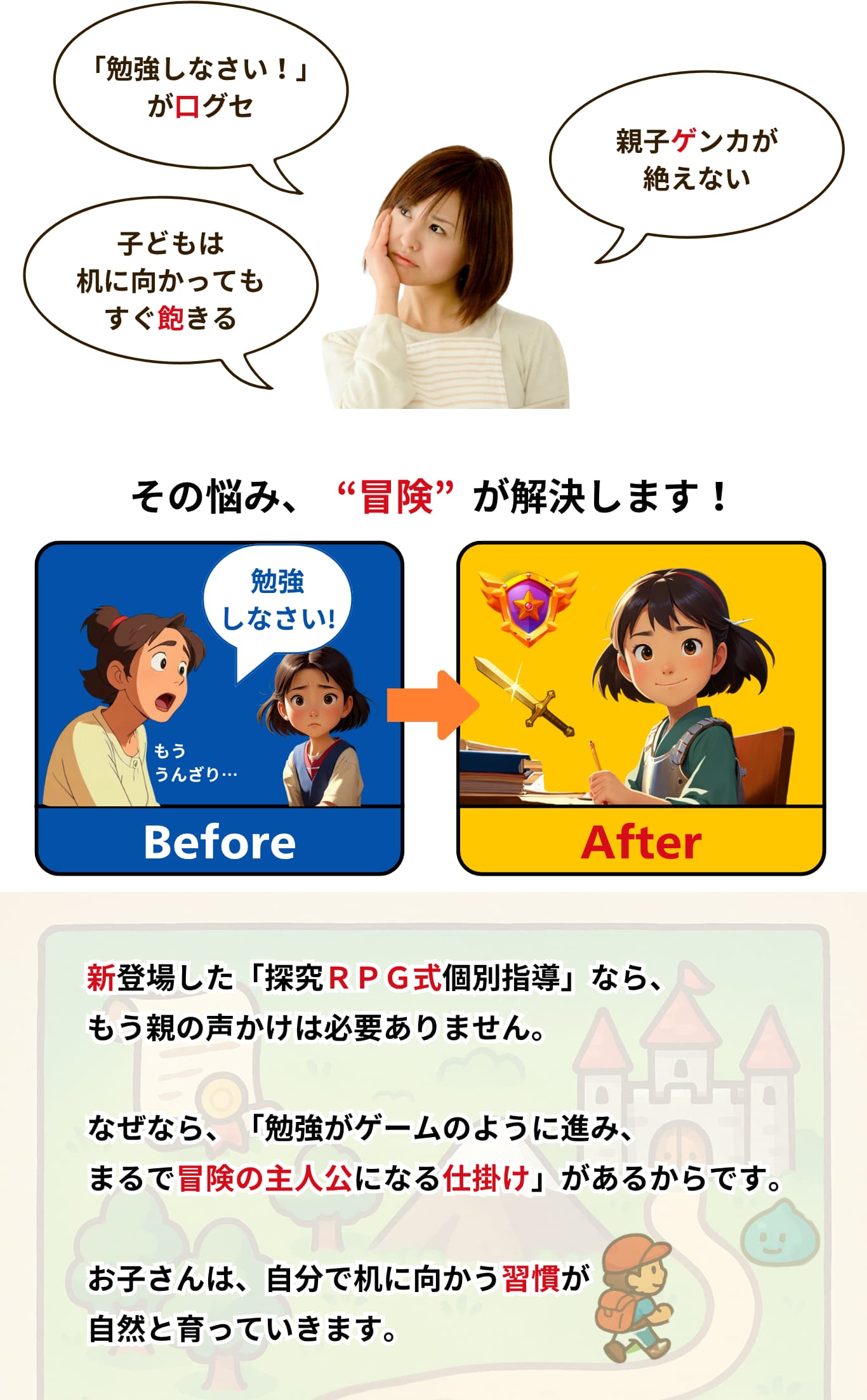 こうした課題を解決し、勉強を“暗記”から“冒険”に変えながら、 偏差値アップと将来に役立つ力を同時に育てます。