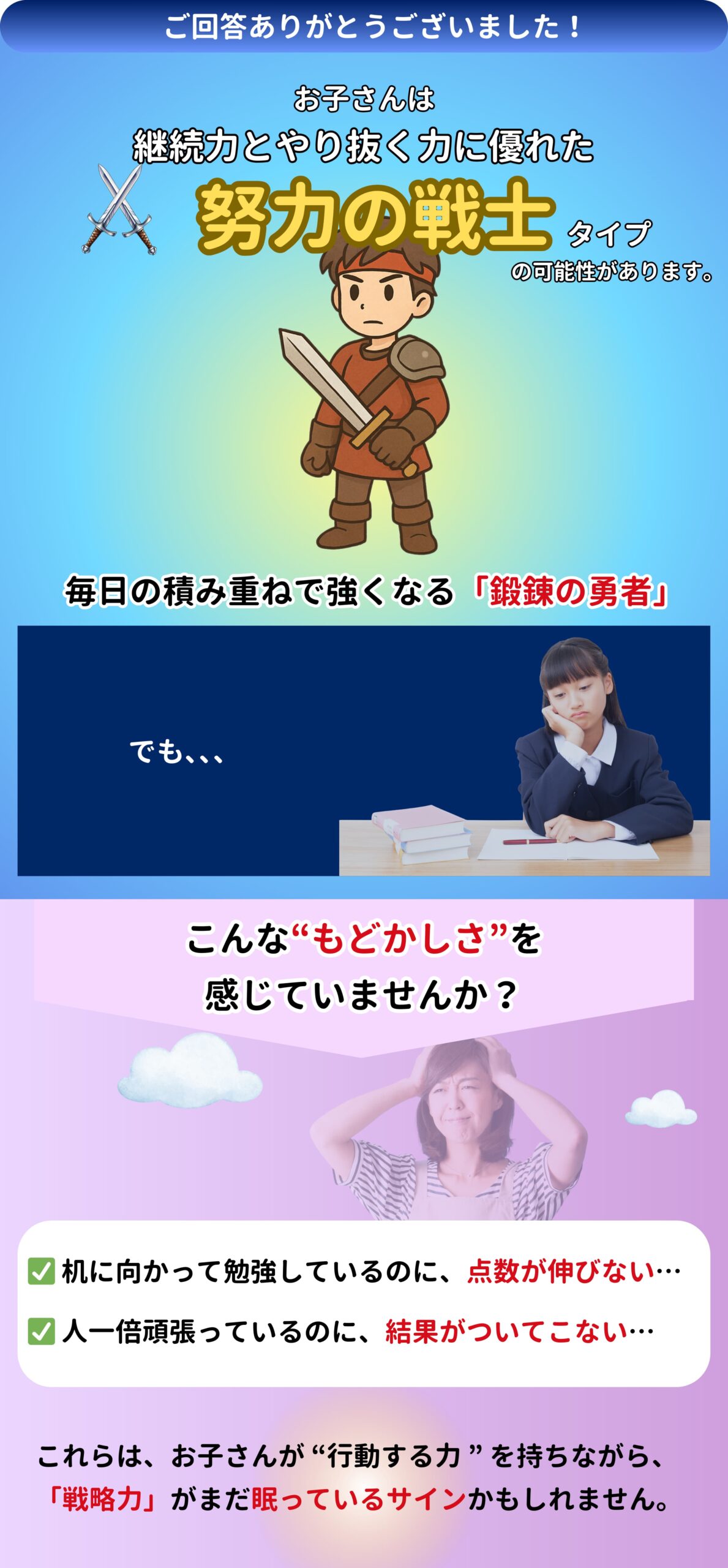 あなたのお子さん専用の「診断レポート【前半】」をこの先の画面ですぐにご覧いただけます。