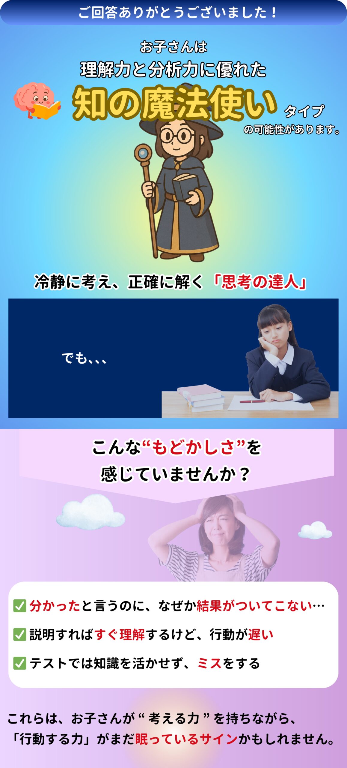 あなたのお子さん専用の「診断レポート【前半】」をこの先の画面ですぐにご覧いただけます。